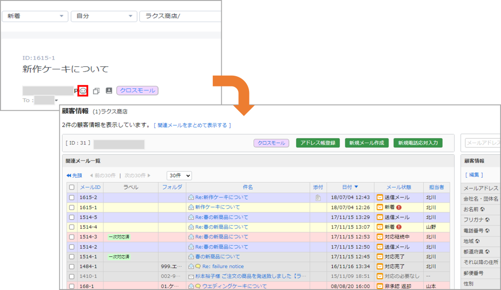 対応する際には、該当顧客からの過去の問い合わせ履歴をワンクリックで