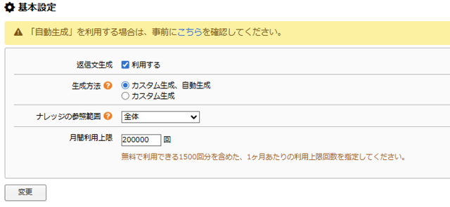3. 「返信文生成」>「基本設定」をクリックする。