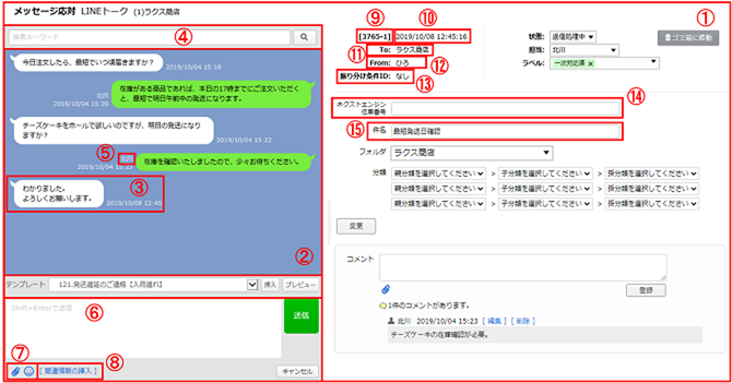 | ⑤ | 担当者 | メッセージを送信したユーザIDを表示 ※担当者はメッセージ毎に割り振りが可能 |