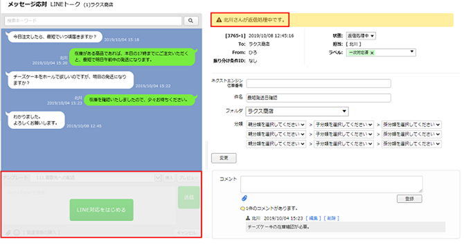 件名をクリックしてメッセージ応対画面を開き、「LINE対応をはじめる」をクリックすると