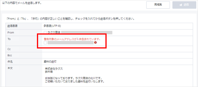 宛先メールアドレスの警告表示