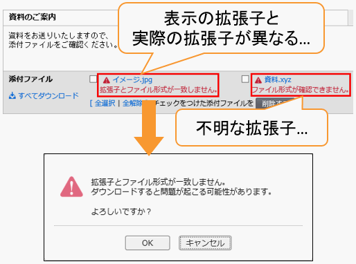 | 危険なファイルを警告!添付ファイルのダウンロードによるトラブルを未然に防止!! |