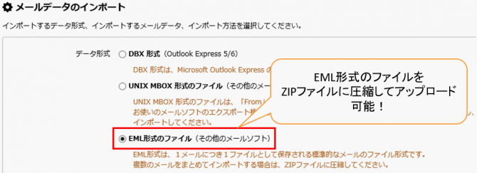 | 一度にアップロードできるファイルサイズは、圧縮した状態で「5MB」です。 ZIPファイル内にEML形式以外のファイルが含まれている場合はエラーになります。 |