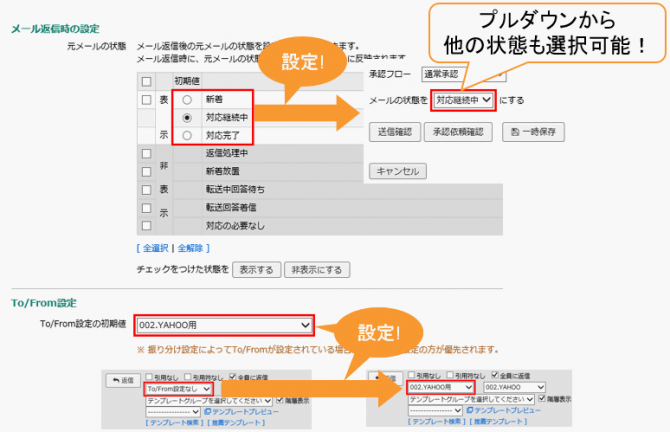 メール作成画面でユーザ単位で返信時の「To/From設定」と「返信後の受信メールの状態」の初期値を