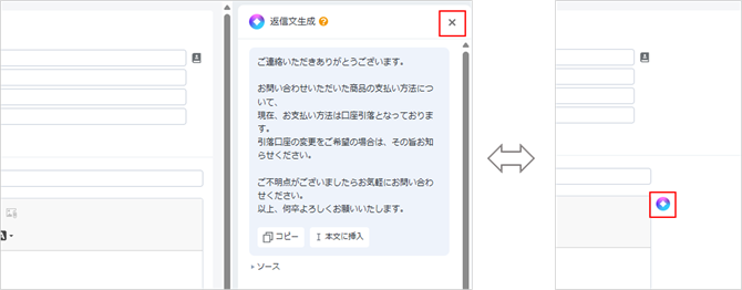 返信メール作成画面で、右側の返信文生成エリアの表示・非表示を切り替えることが